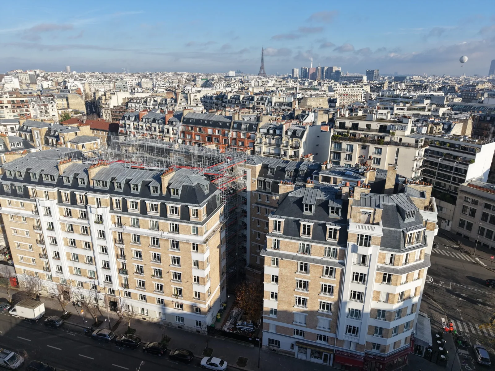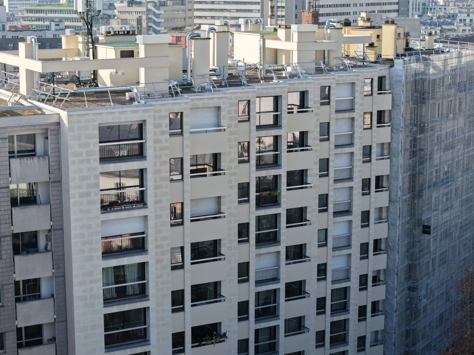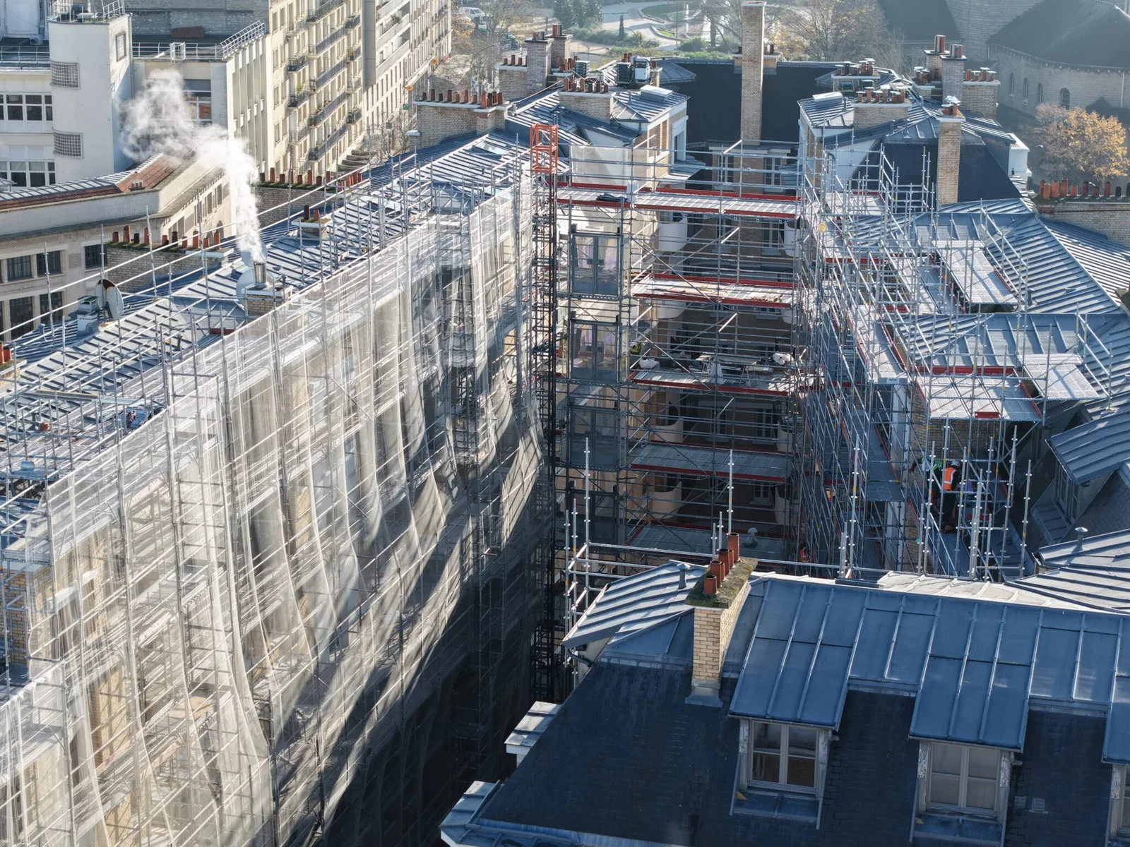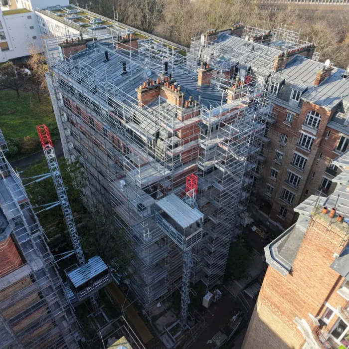 Reportage sur la rénovation d’un quartier emblématique du 13e arrondissement, avec intervention sur la brique, les garde-corps et les toitures. Des vues aériennes capturent l’ampleur et la diversité des travaux en cours.