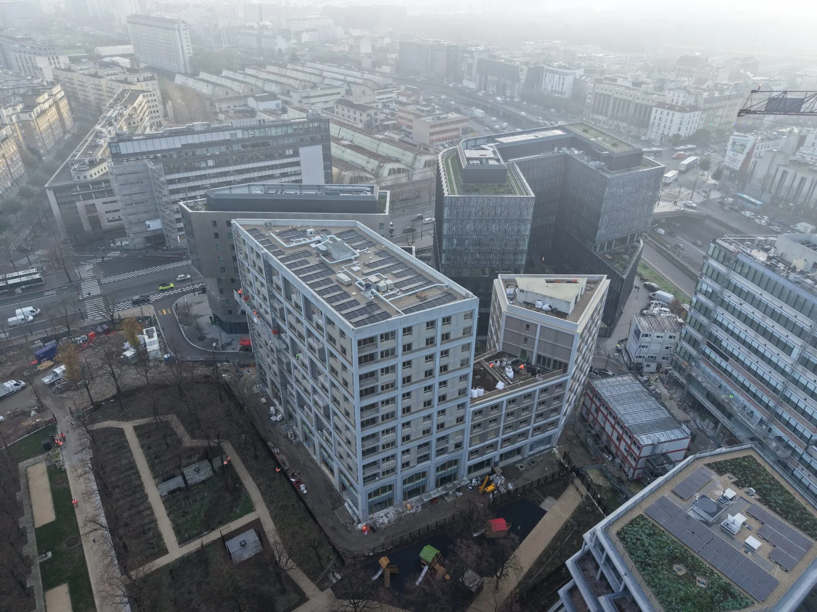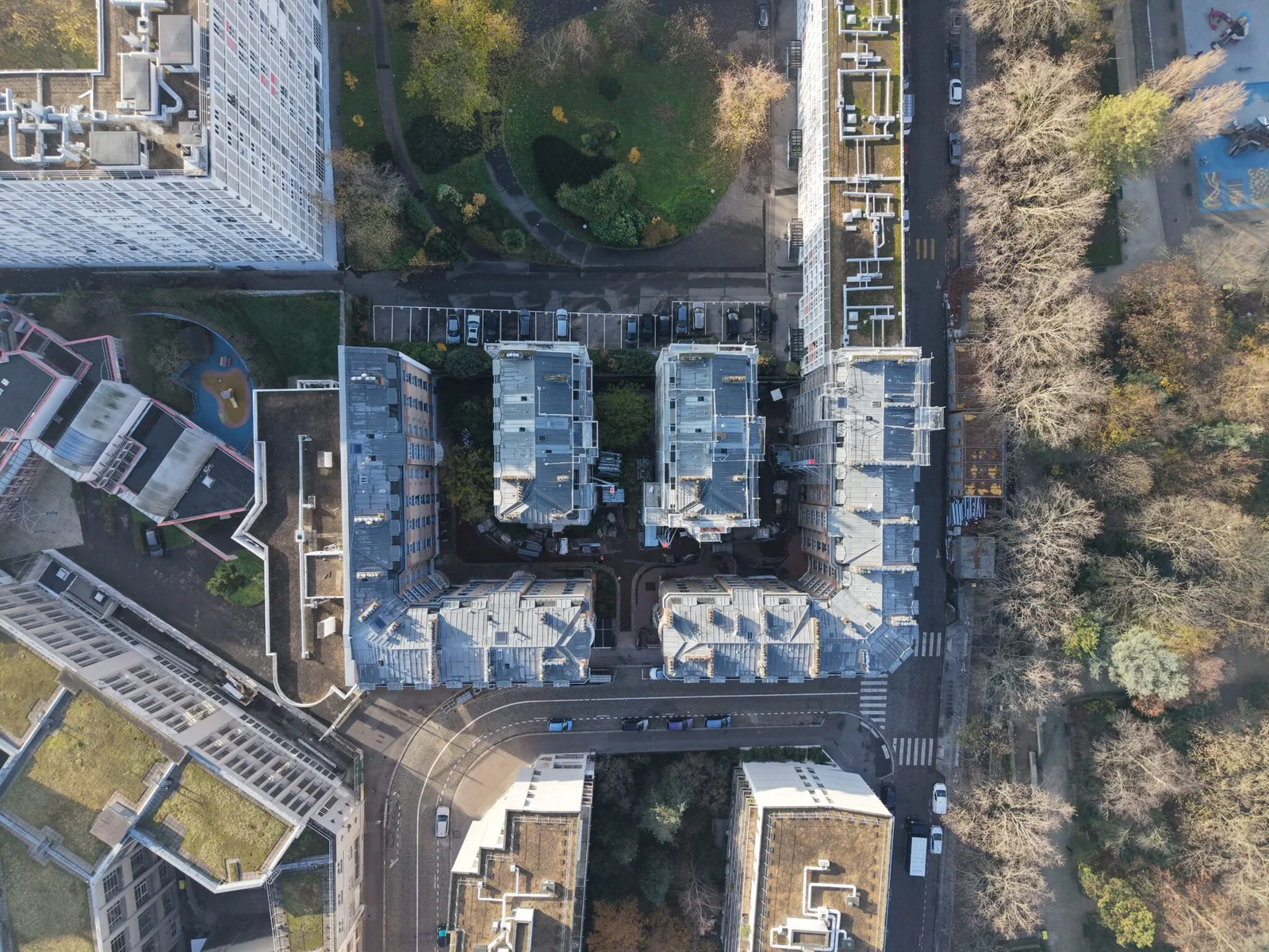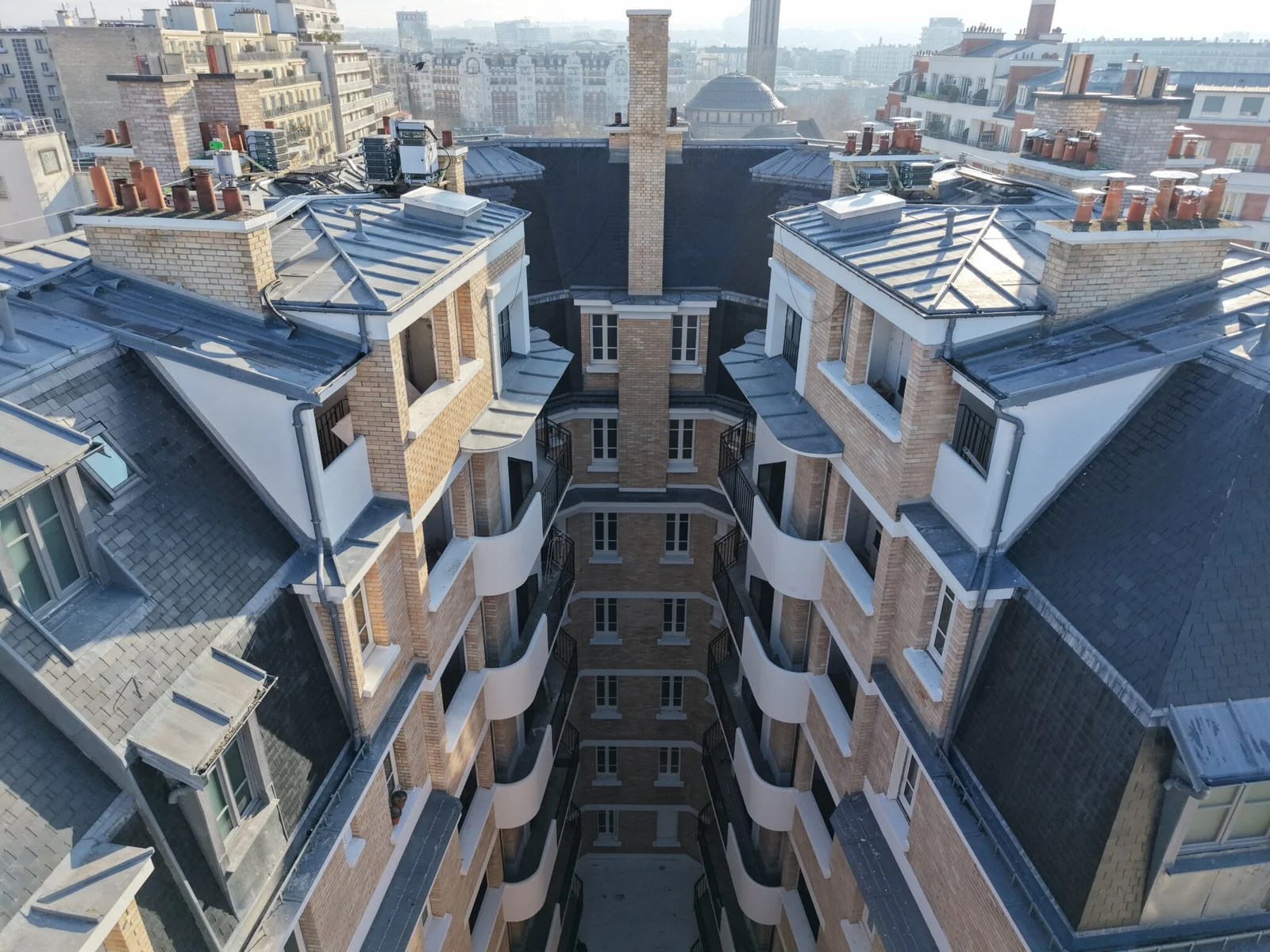 Reportage sur la rénovation d’un quartier emblématique du 13e arrondissement, avec intervention sur la brique, les garde-corps et les toitures. Des vues aériennes capturent l’ampleur et la diversité des travaux en cours.