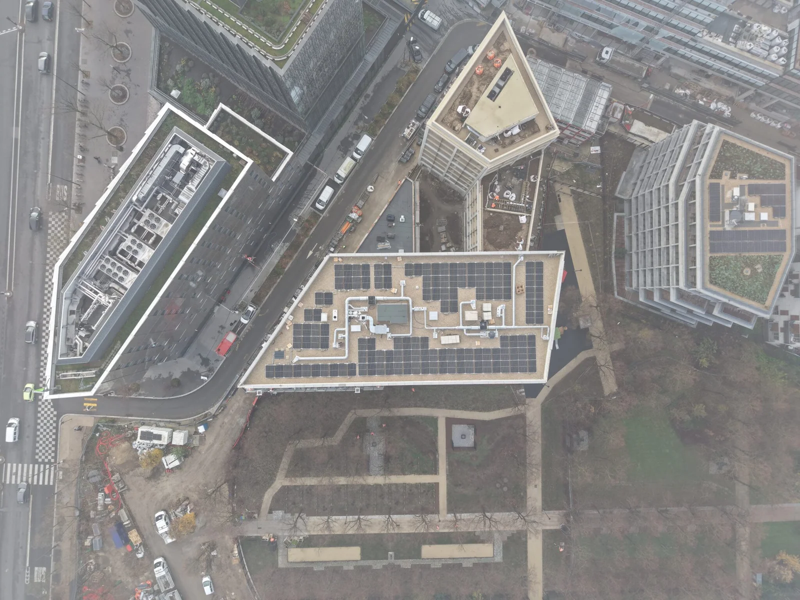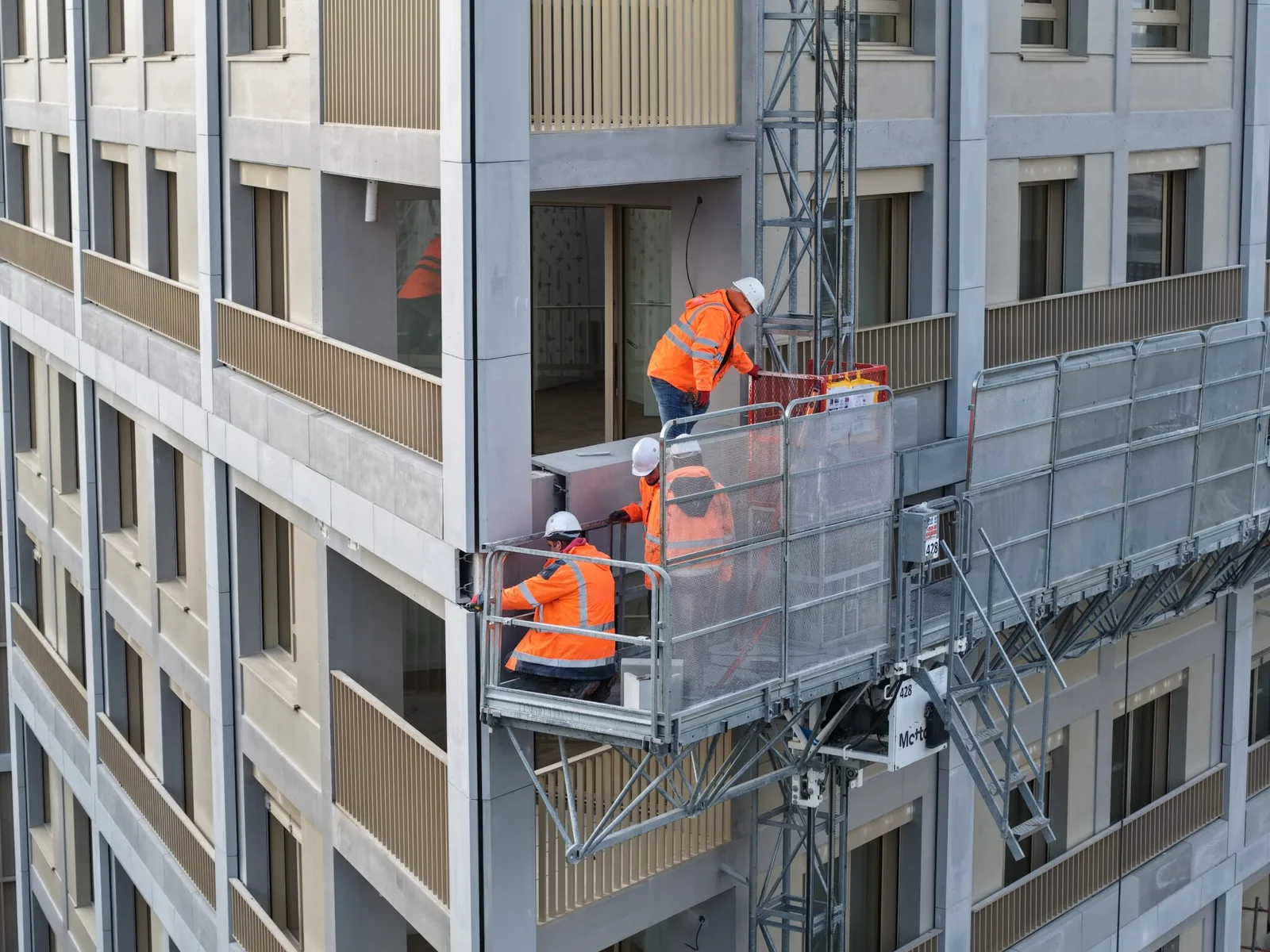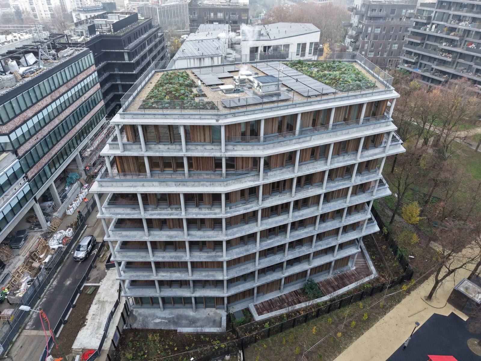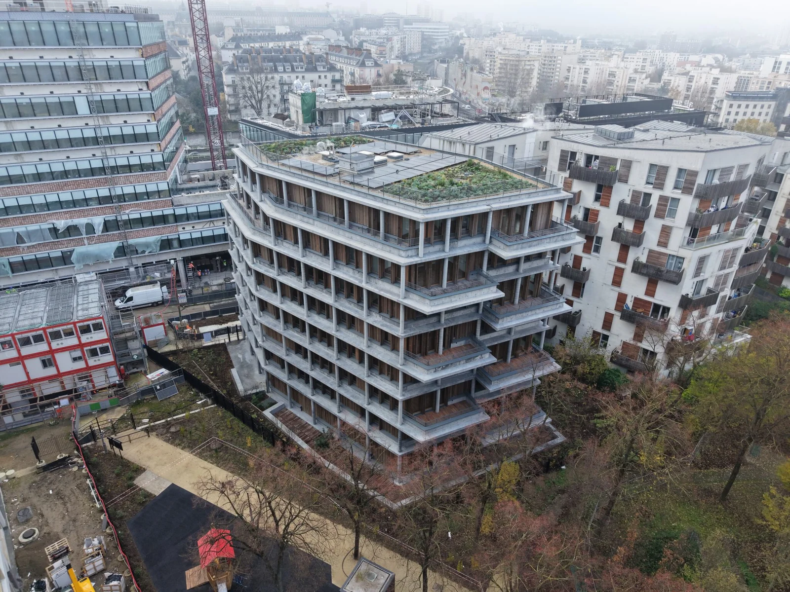 Reportage vidéo sur un chantier livré en 2024, présentant un bâtiment en forme d’escalier et en bloc. Nos images montrent la rénovation de la surface et des garde-corps avec des vues aériennes immersives.