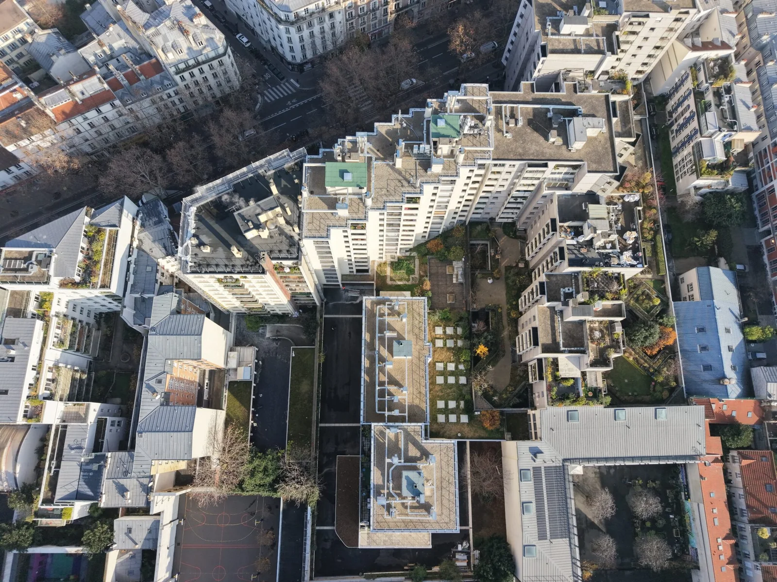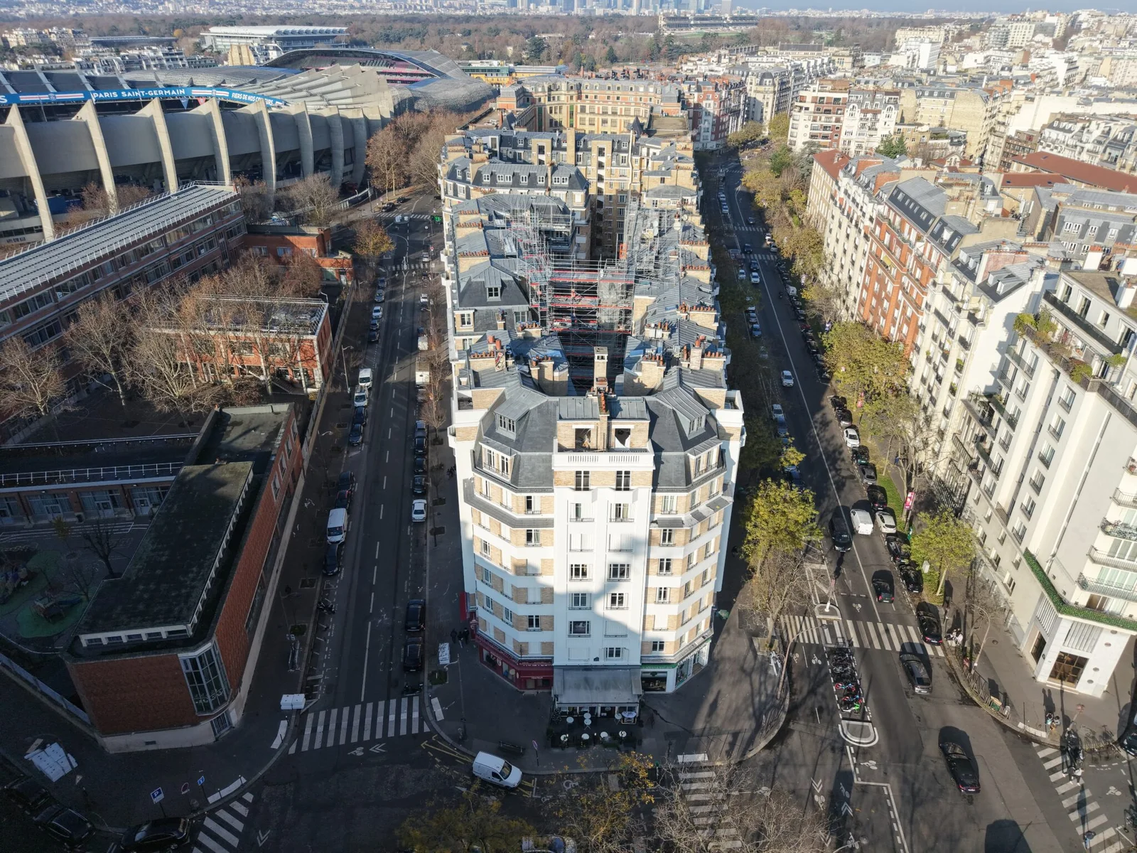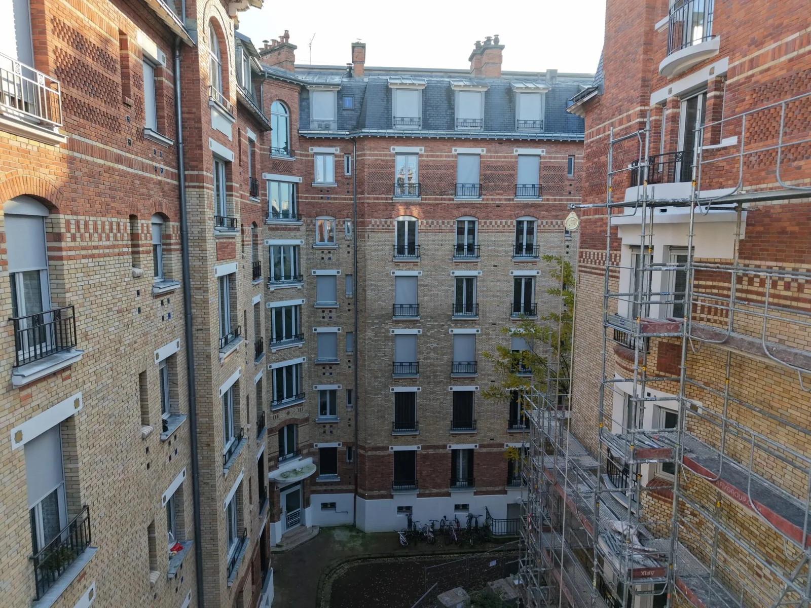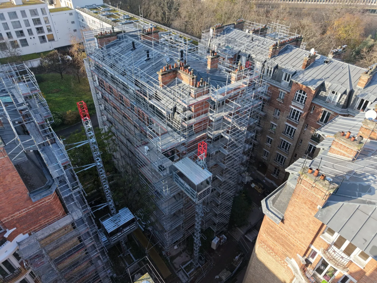 Mise en image d’un chantier complexe dans le 16e arrondissement, impliquant la rénovation de plusieurs immeubles en brique et la création d’un îlot central pour faciliter la circulation des opérateurs.